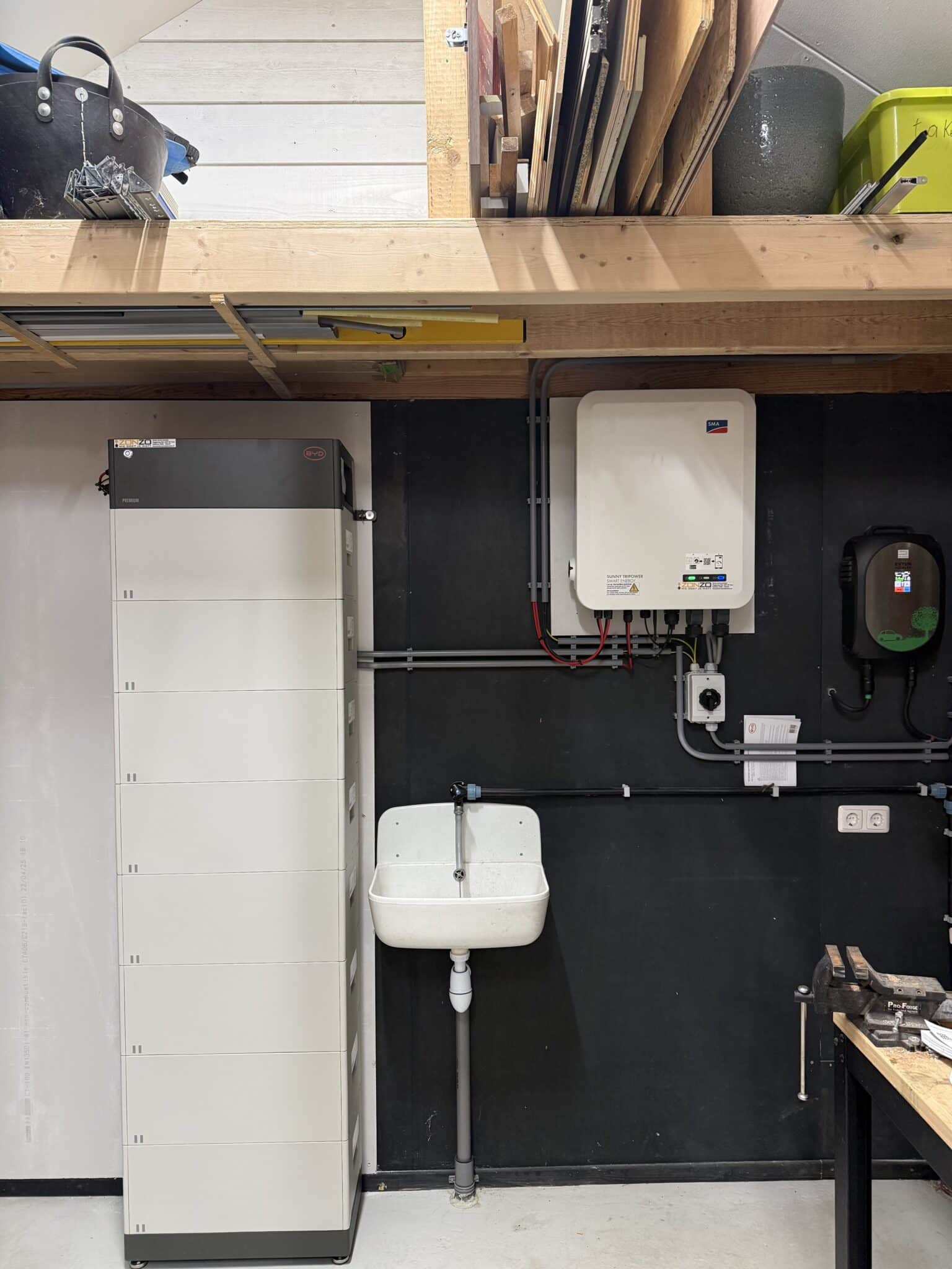 De installatie werkt samen met een SMA omvormer, aangestuurd door de SMA Sunny Home Manager. Dit systeem zorgt ervoor dat de opgewekte zonnestroom zo slim mogelijk wordt verdeeld over: