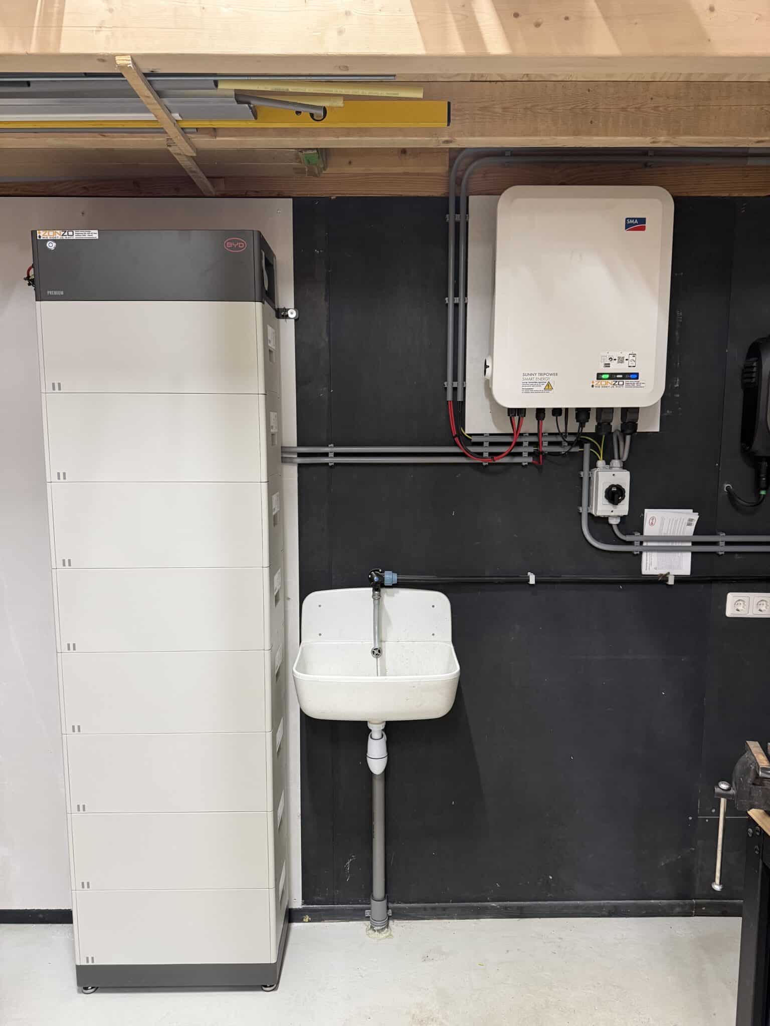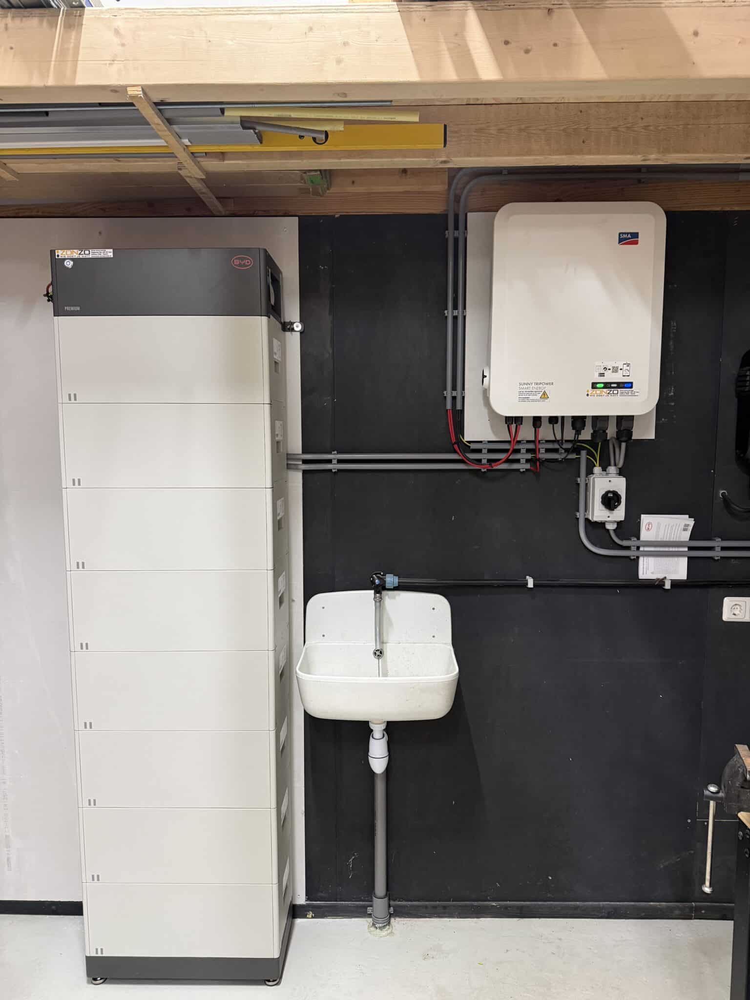 Omdat de bestaande hybride omvormer al geschikt was voor een thuisbatterij, konden wij de batterijtoren snel en netjes plaatsen in de technische ruimte.